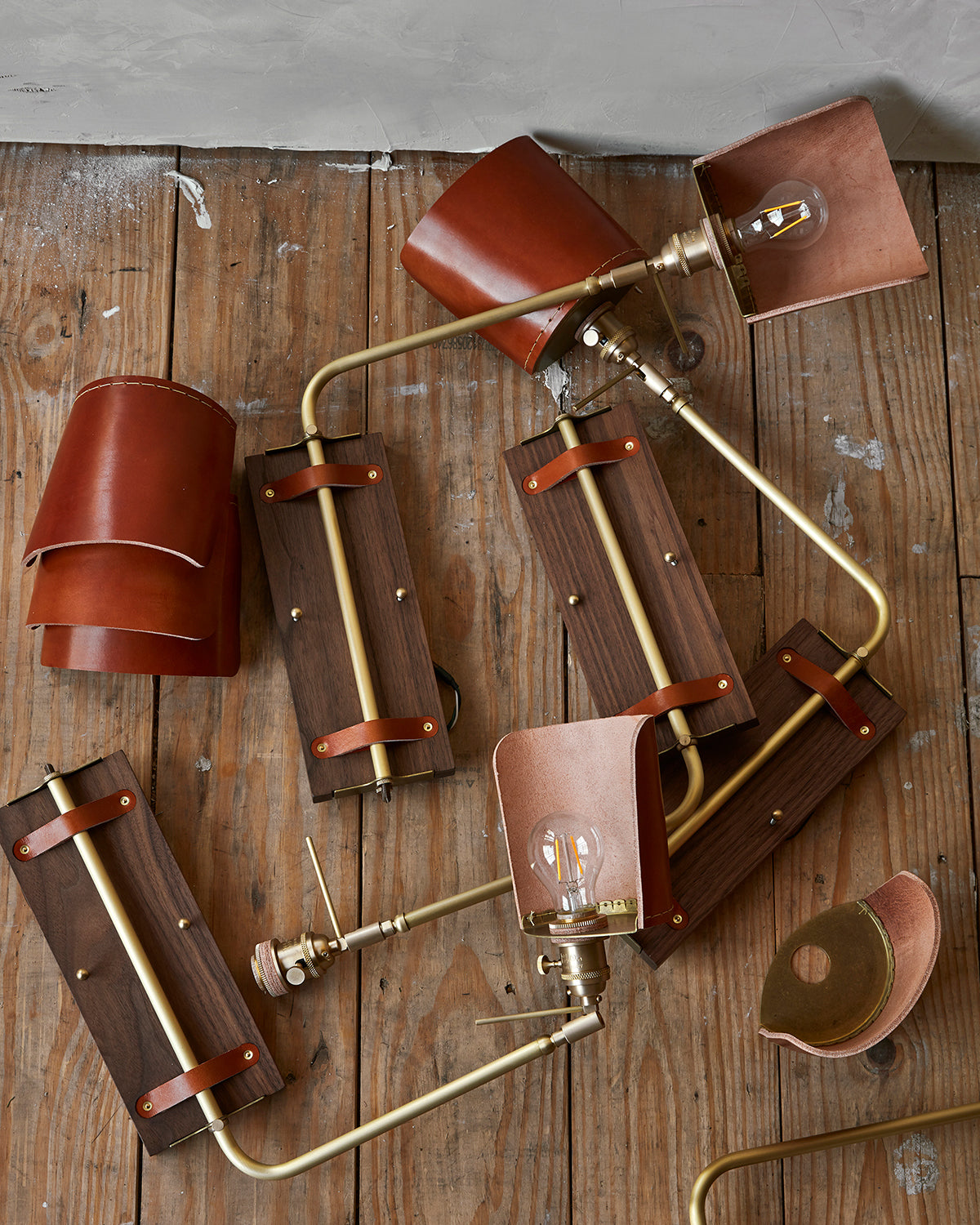 Black walnut wooden wall sconce with articulating brass arm and tan leather